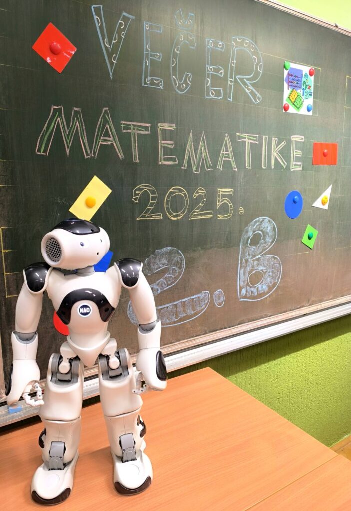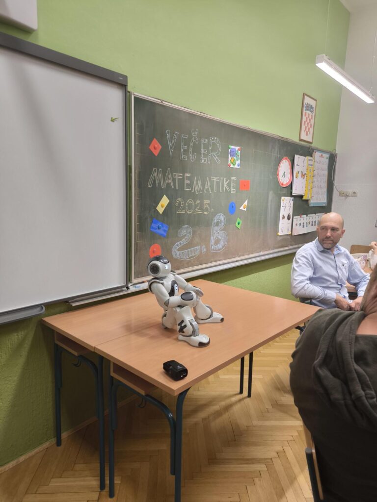 The NAO robot was a special guest at the event “Math Evening” held in class 2b at the First Primary School Čakovec. NAO greeted all participants, introduced the planned activities, and actively supported students as they explored geometric solids and their real-life applications through engaging conversation.